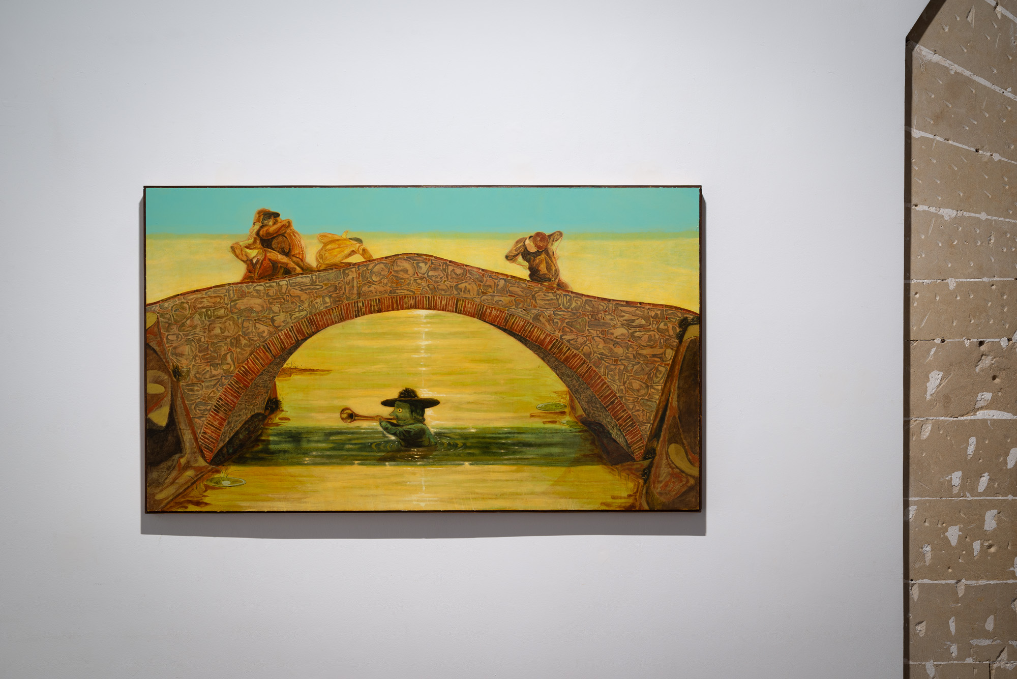 A través de este enfoque, las pinturas se convierten en meditaciones sobre cómo las energías invisibles, ya sean sónicas, espirituales o psíquicas, se mueven a través del espacio y se instalan en el cuerpo. Como tales, se consideran objetos, artefactos que pueden existir dentro de la realidad representada. Haciendo referencia a la tradición multicapa de los iconos del cristianismo ortodoxo, trascienden la imagen y se consideran agentes activos, manifestaciones o portales a una realidad paralela. Al igual que las imágenes de escenas de la Sagrada Escritura pintadas sobre paneles de madera con témpera al huevo y pan de oro no son meras herramientas didácticas, sino recipientes espirituales que afirman la realidad de la Encarnación, las pinturas de Pokrovskii se convierten en portadoras de estados de ánimo, umbrales entre la realidad y el sueño, y contenedores de lo invisible. Esta ruptura con la realidad culmina en un resplandor dorado, como si todo se viera a través de un filtro ámbar. Con tonos arcillosos que dominan la imagen (interrumpidos ocasionalmente por evocadores cielos esmeralda o turquesa), el ambiente de momentos que, de otro modo, serían alegres, quizás traviesos, se transformam en solemnidad o incluso desaliento. Estos colores, junto con pinceladas crudas y sin mezclar, intensifican la emoción, insinuando presión, alienación o sobreestimulación. Una sobreestimulación provocada por la música, los estados de ánimo o incluso frecuencias tácitas, que altera la postura, la respiración y el pensamiento y provoca trastornos emocionales o sociales. Estas fuerzas inmateriales eluden la lógica y se instalan en algún lugar más profundo, donde influyen en la percepción y, a veces, sin previo aviso, se apoderan del cuerpo por completo. Y en el universo de Pokrovskii, convierten la melodía en una enfermedad.