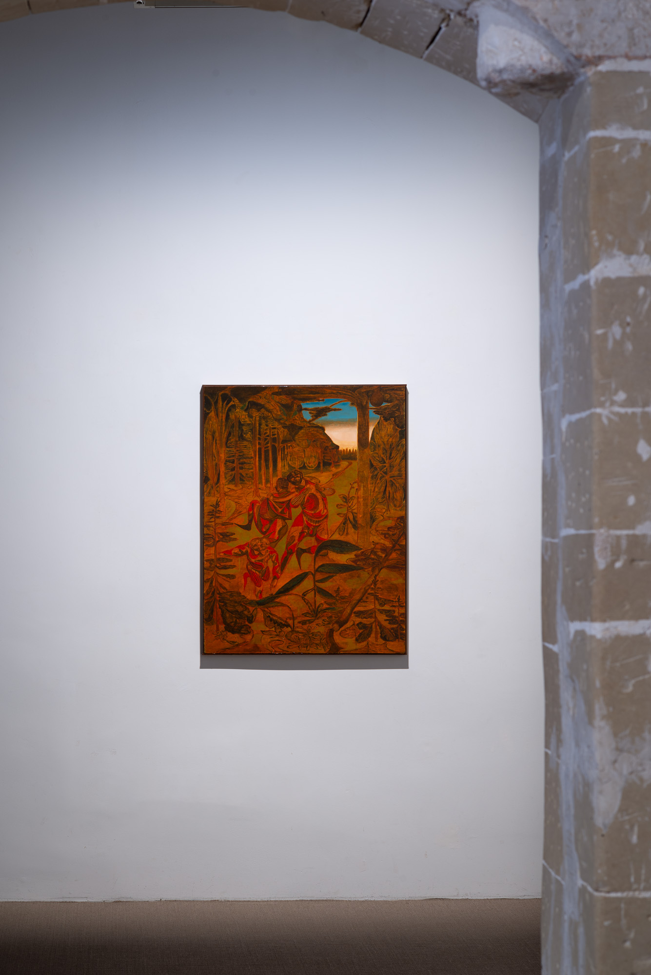 Con esto en mente, las pinturas se resisten al realismo en favor de la resonancia, invitando a una mirada más lenta, profunda y en sintonía, más allá de la propia imagen. En cuanto a la composición, parecen cuadros vivientes, pausas teatrales coreografiadas que crean momentos de suspensión, tensión y claridad visual. Quizás, en un guiño a la escuela sienesa y a un enfoque más lírico y narrativo, arraigado en la comprensión del espacio anterior al Renacimiento e impregnado de espiritualidad, la profundidad también se percibe como superficial pero legible, con una escala y una perspectiva inconsistentes. Las figuras estilizadas parecen menos vivas y más como extensiones de su entorno, lo que contribuye a la sensación de espacios interiores pero radiantes que crean la sensación de ser atraídos hacia la imagen. La perspectiva representada es intencionadamente antinaturalista y está diseñada para desanclar al espectador de lo cotidiano e invitar a la contemplación.