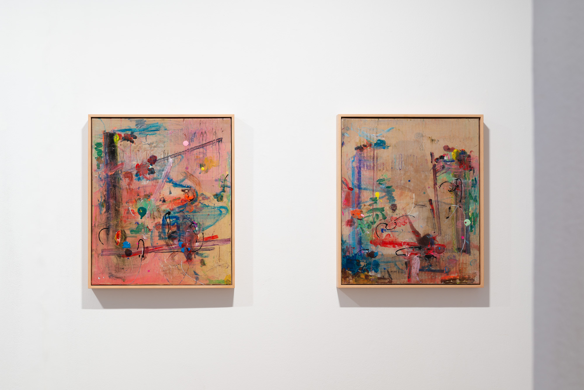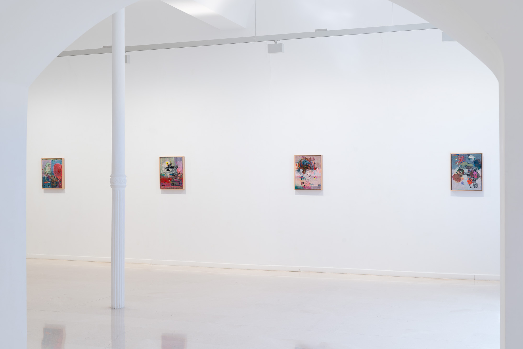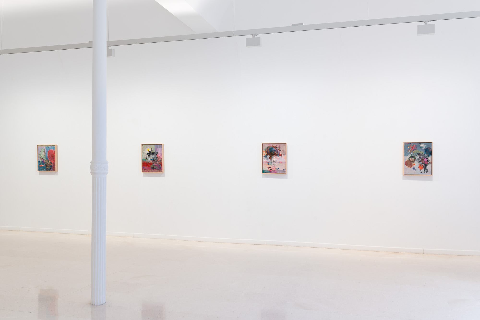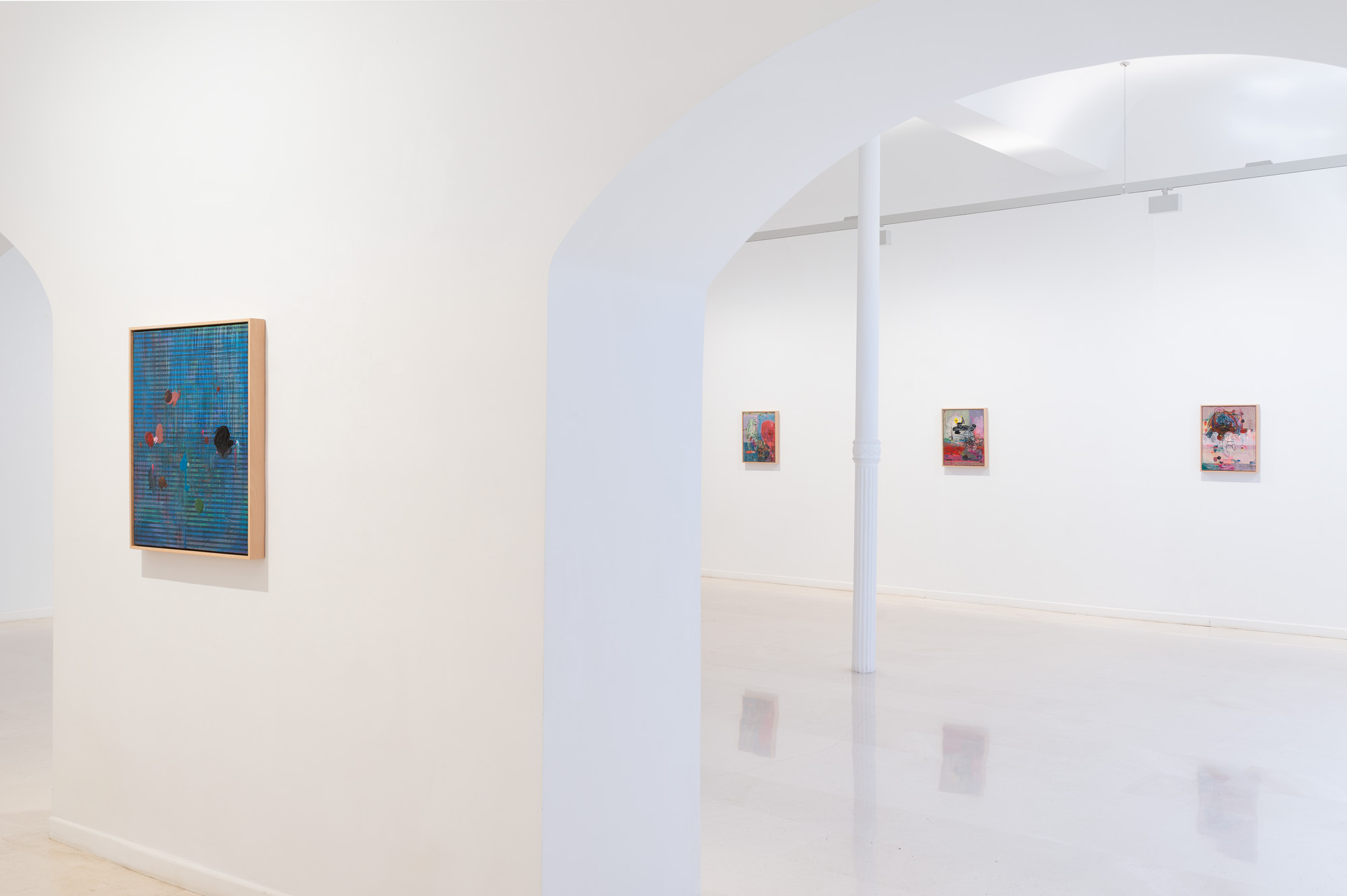 Una y otra vez son interrumpidas por intervenciones pictóricas: pequeños puntos de color, líneas delicadas o formas fragmentarias. Así surge un espacio pictórico que es al mismo tiempo preciso y sorprendentemente abierto.