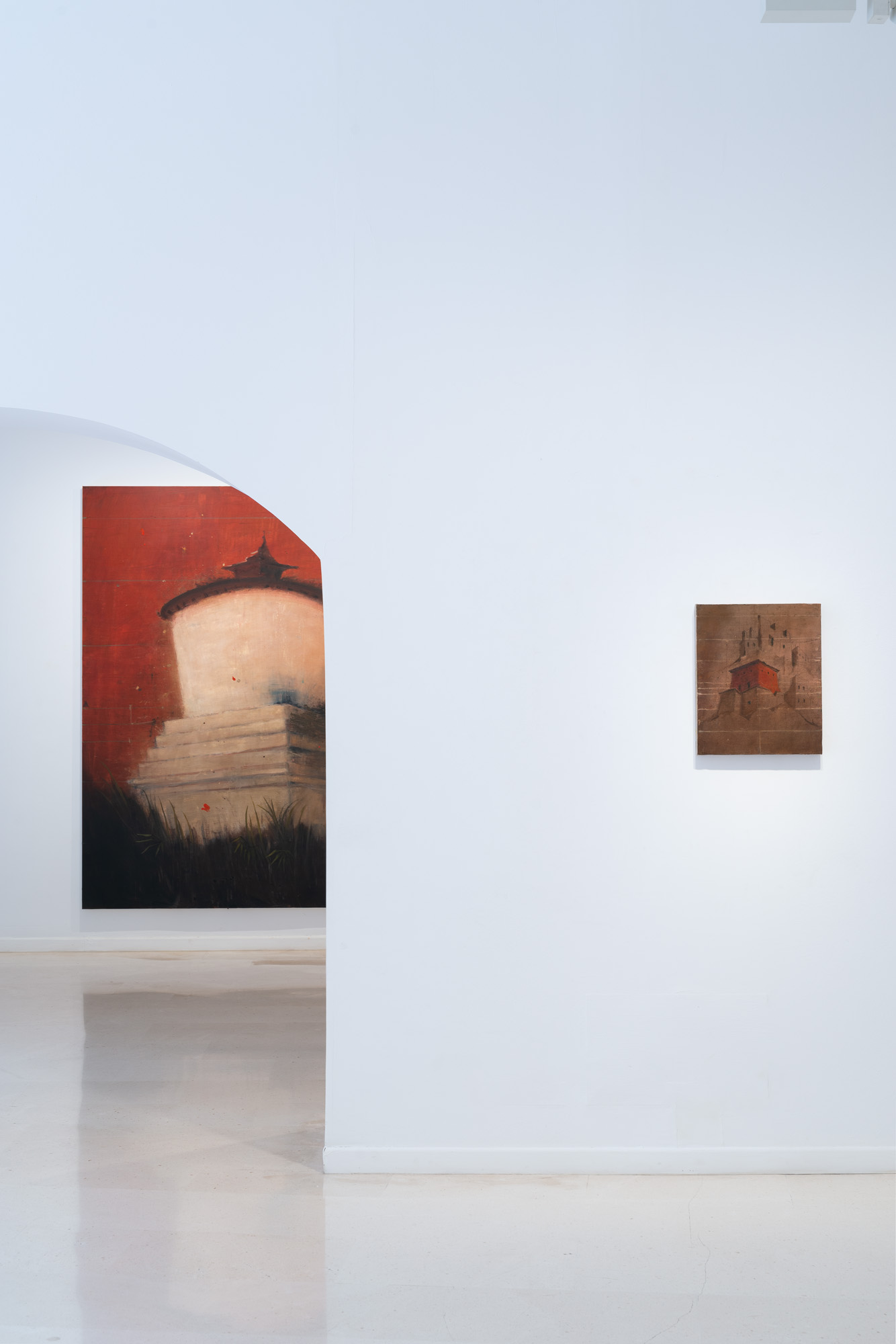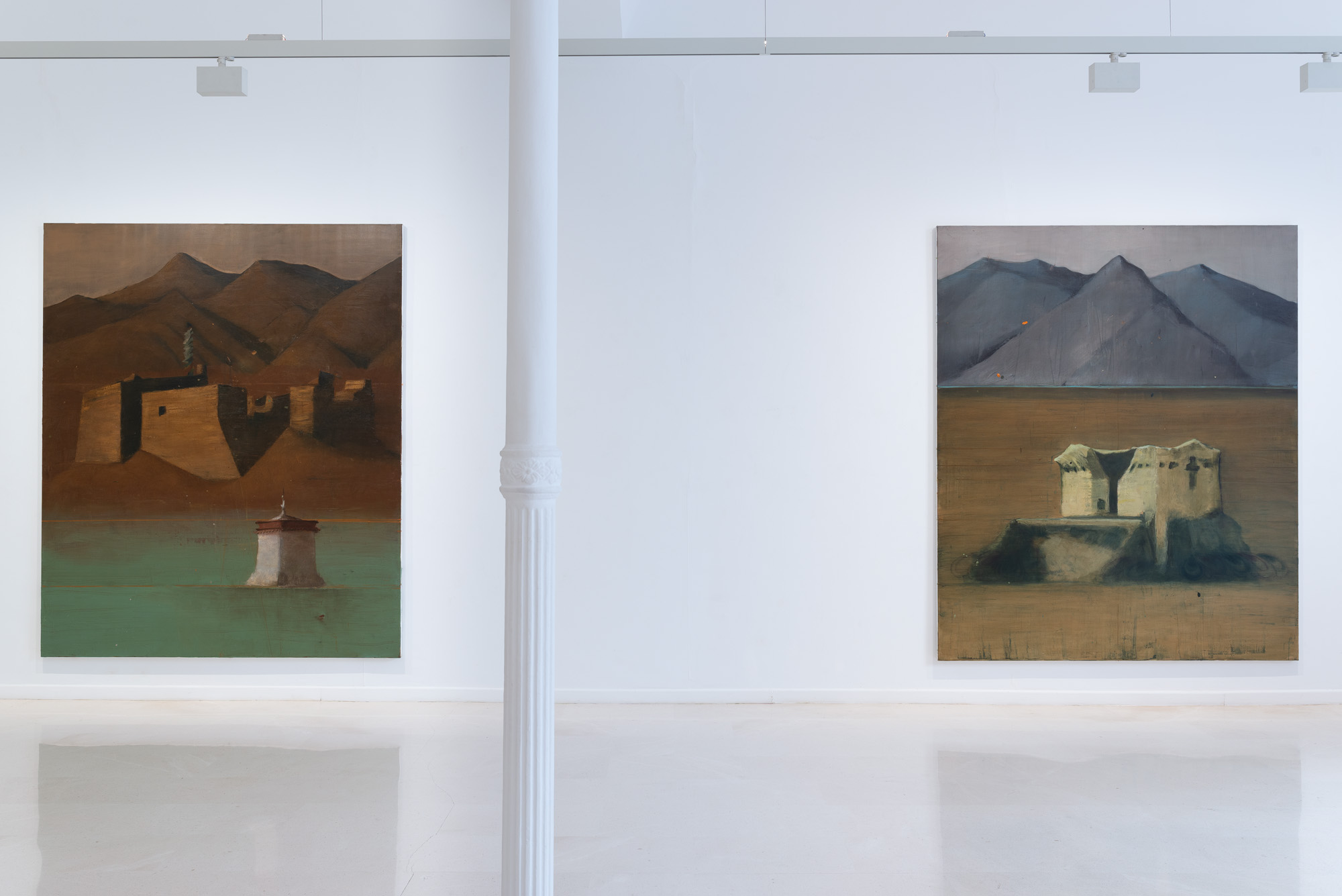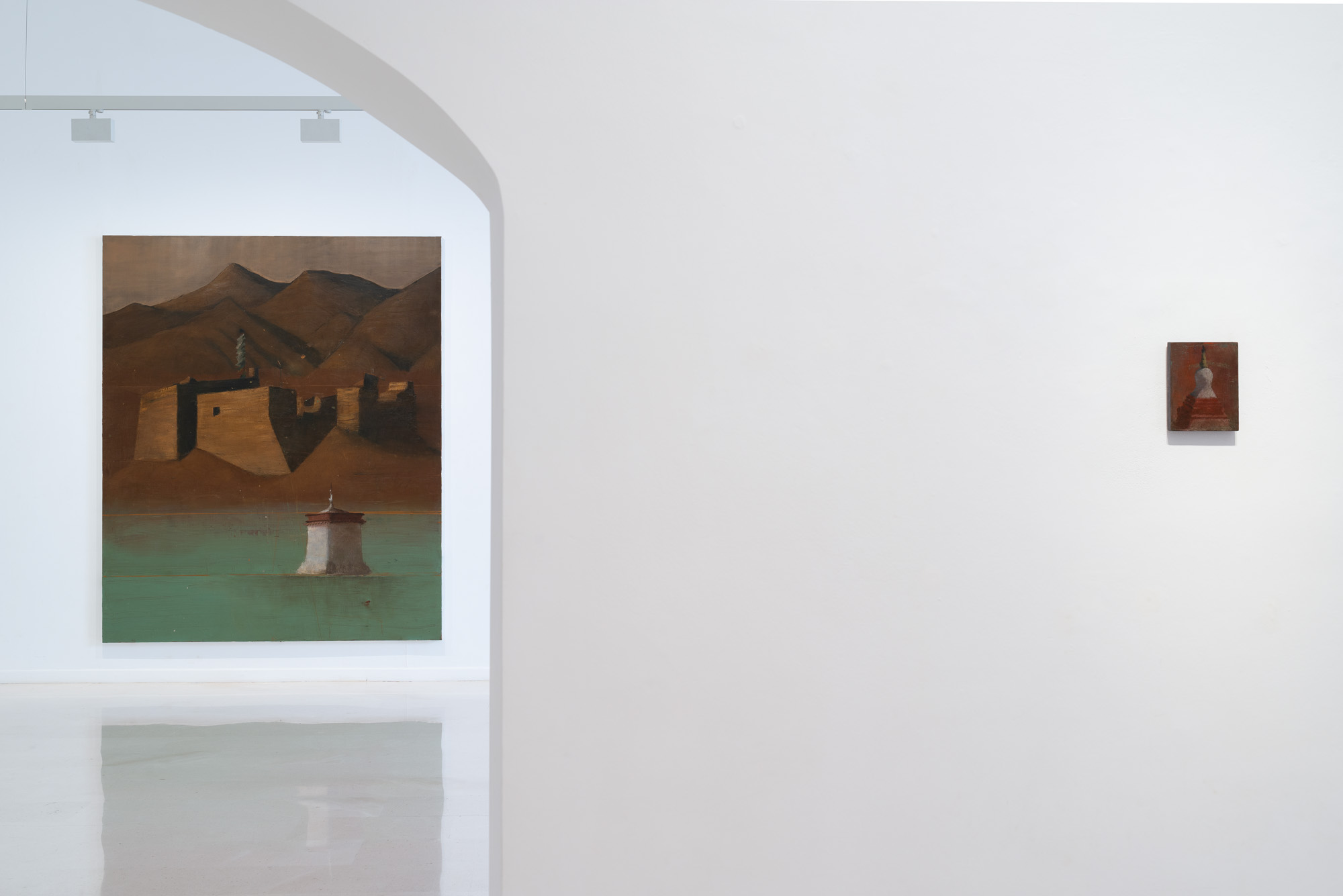 Las pinturas presentes en la exposición Ni mundo interior ni mundo exterior de Alejandro Campins en la Galería Pelaires, ofrecen una alternativa a este fenómeno. En términos compositivos, las obras expuestas siguen un formato básico de estructuras arquitectónicas aisladas y paisajes escarpados. Las estructuras se encuentran en diversos estados de ruina, deterioro y destrucción; los paisajes están despejados y bastante desolados. Podemos reconocer las estructuras como estupas, o estructuras religiosas y simbólicas budistas. Sabemos por los títulos de las obras, pertenecientes a la serie Tíbet, que el paisaje es el del Himalaya, concretamente la región geográfica conocida popularmente como el "Techo del Mundo", la meseta más alta y extensa del mundo.