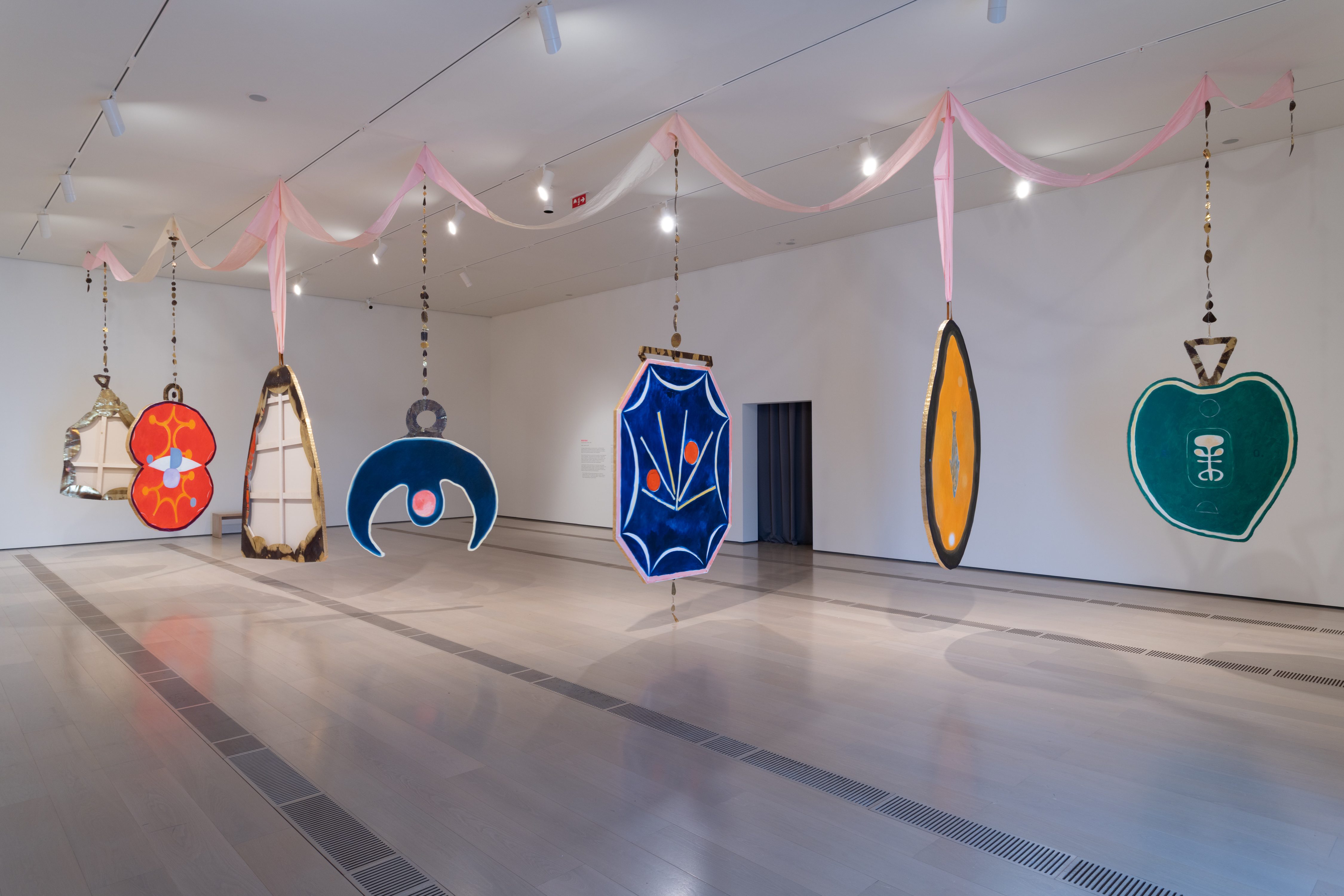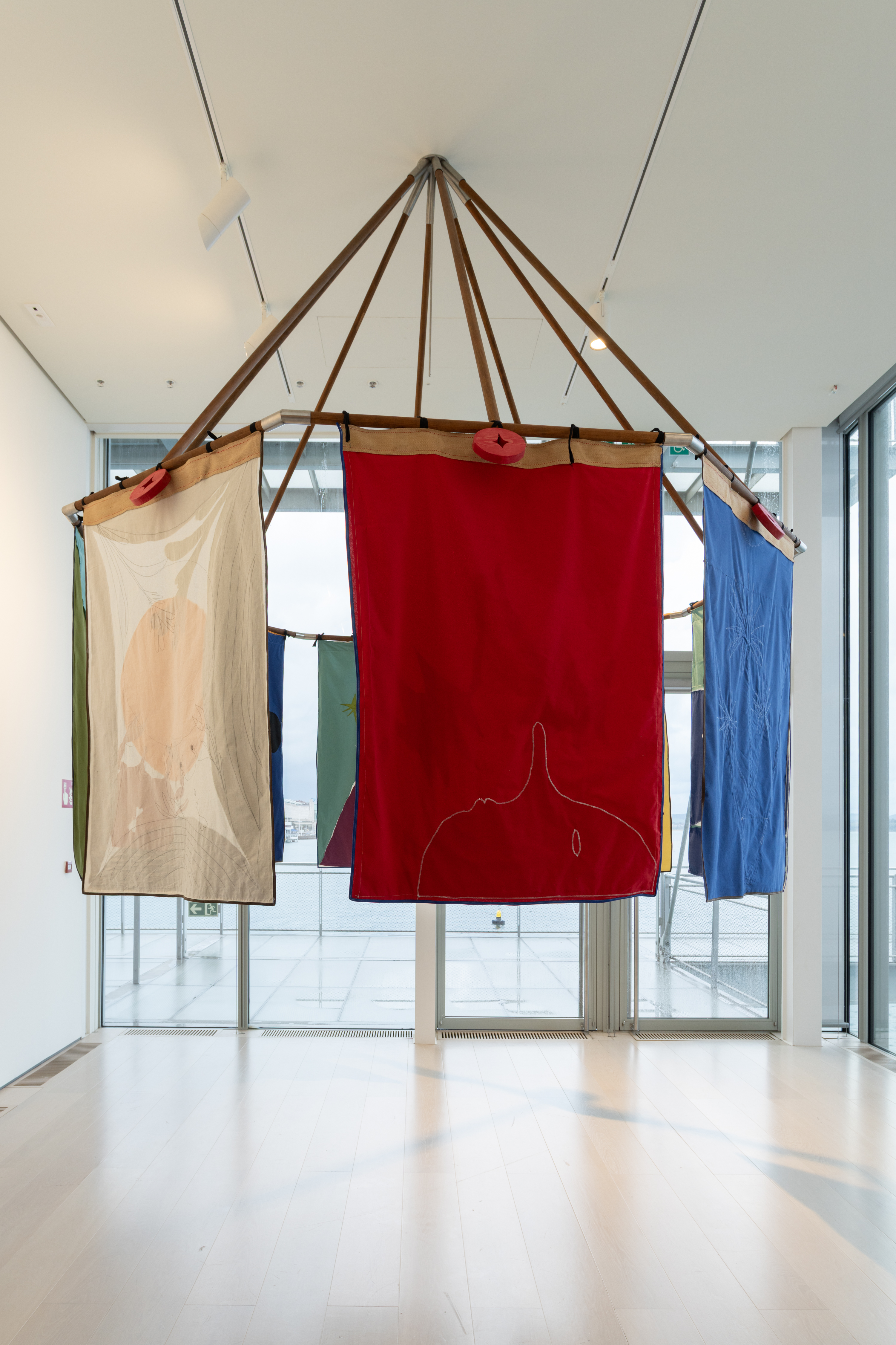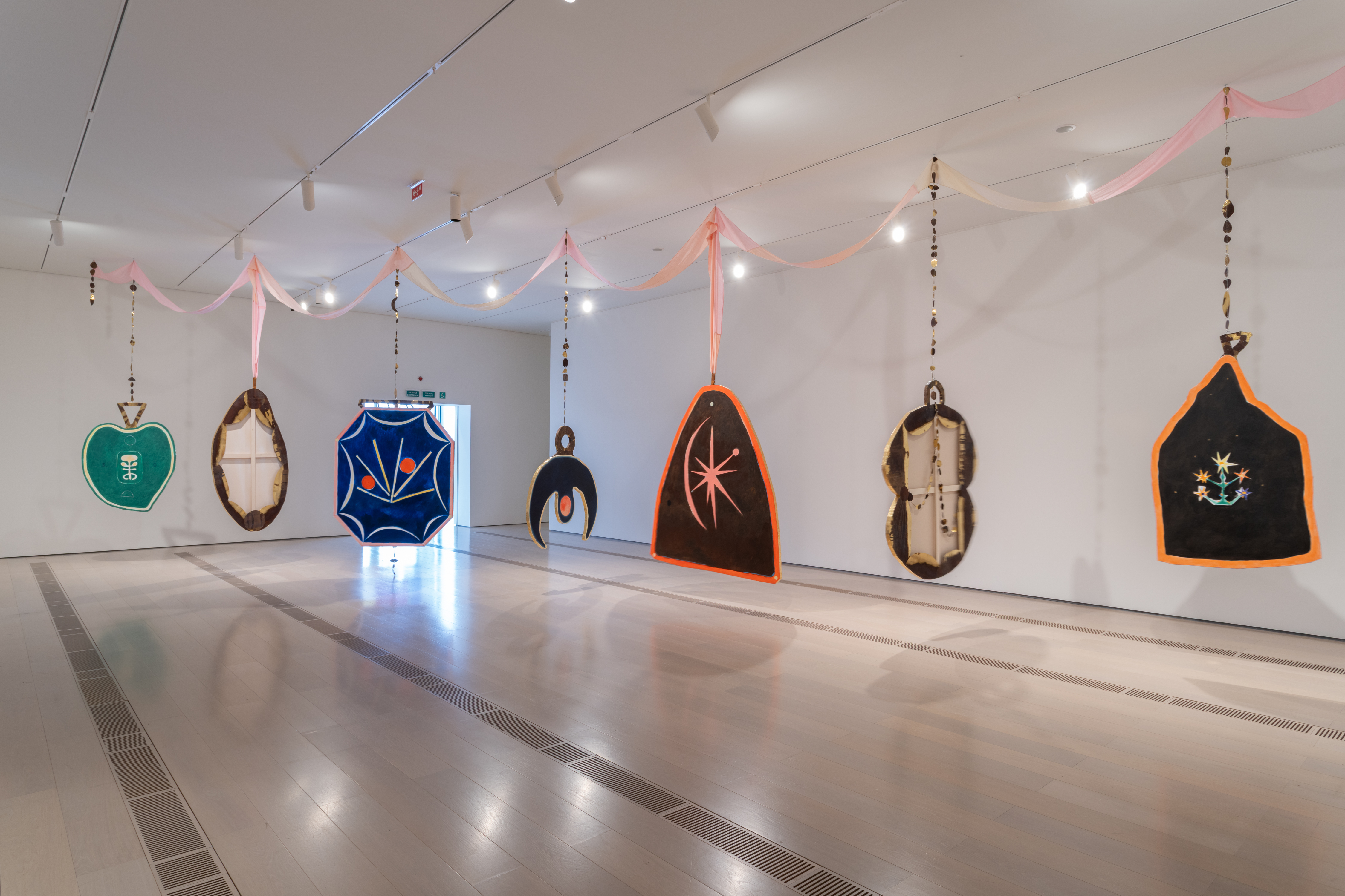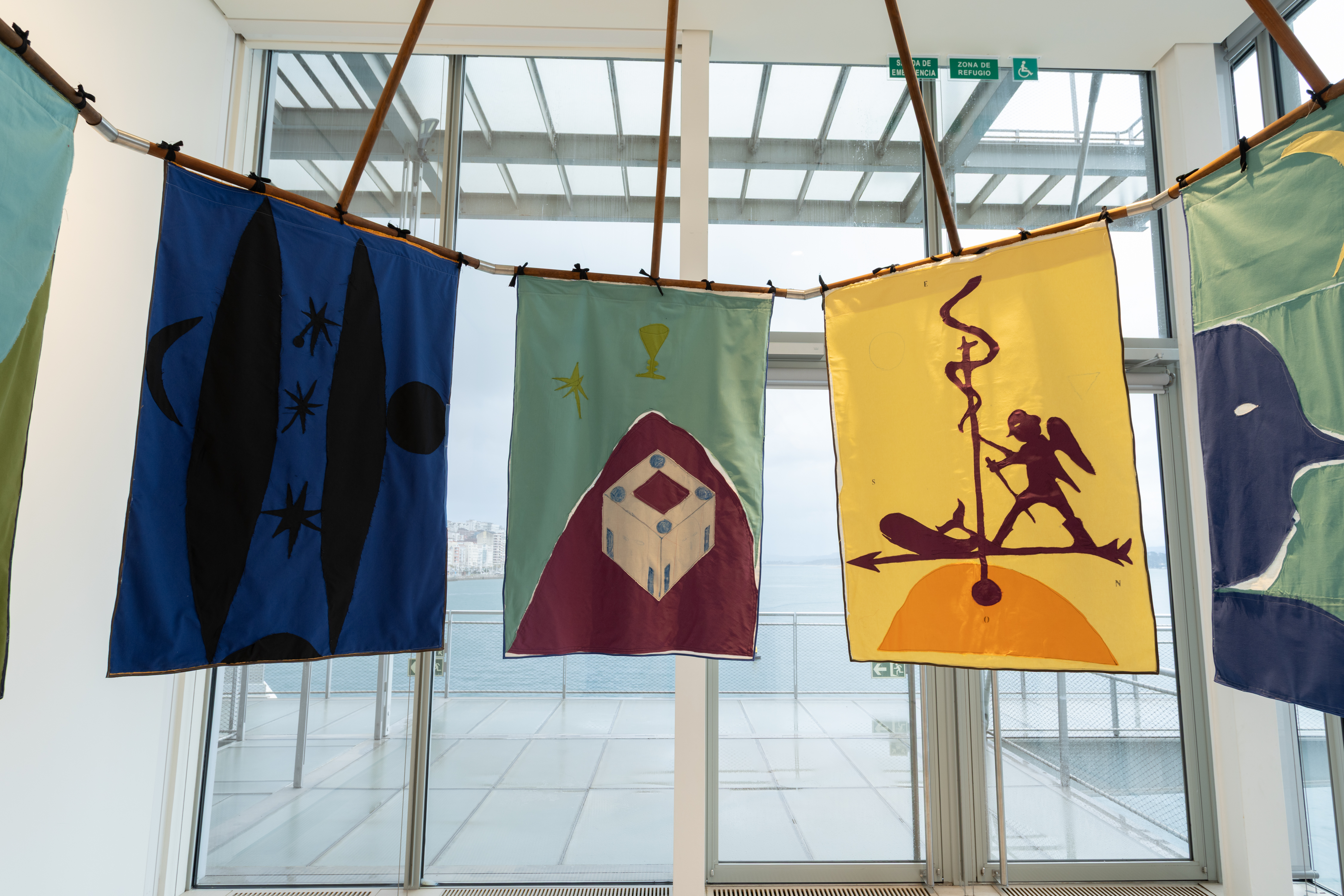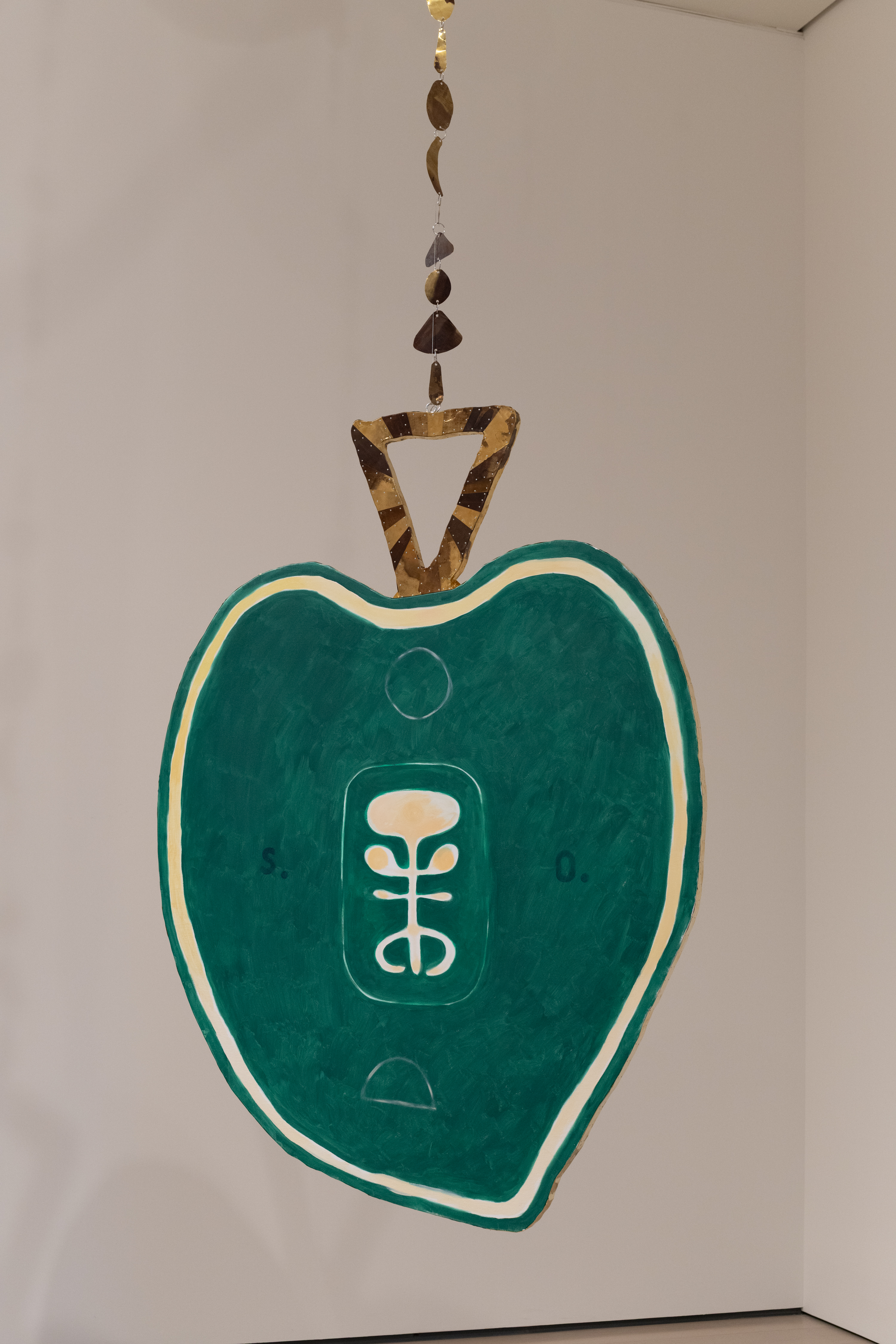 En el centro de la muestra destaca un textil que sostiene siete amuletos gigantes, unidos en cadena; cada uno combina materiales, palabras y fragmentos culturales, funcionando como un nudo simbólico de deseos y memorias, una cadena de sortilegios escritos con hilo, tela y pintura. La pieza tensiona la frontera entre el objeto votivo, que mira al pasado como agradecimiento, y el amuleto, que se orienta al futuro como promesa o protección. Con todo ello, la obra se presenta como una reflexión sobre el poder de las imágenes y los objetos, y su capacidad para fundirse con lo espiritual y lo material, para proteger y a la vez embellecer, invitándonos a recorrer el espacio y a reconocernos en el cruce entre arte, devoción y deseo.