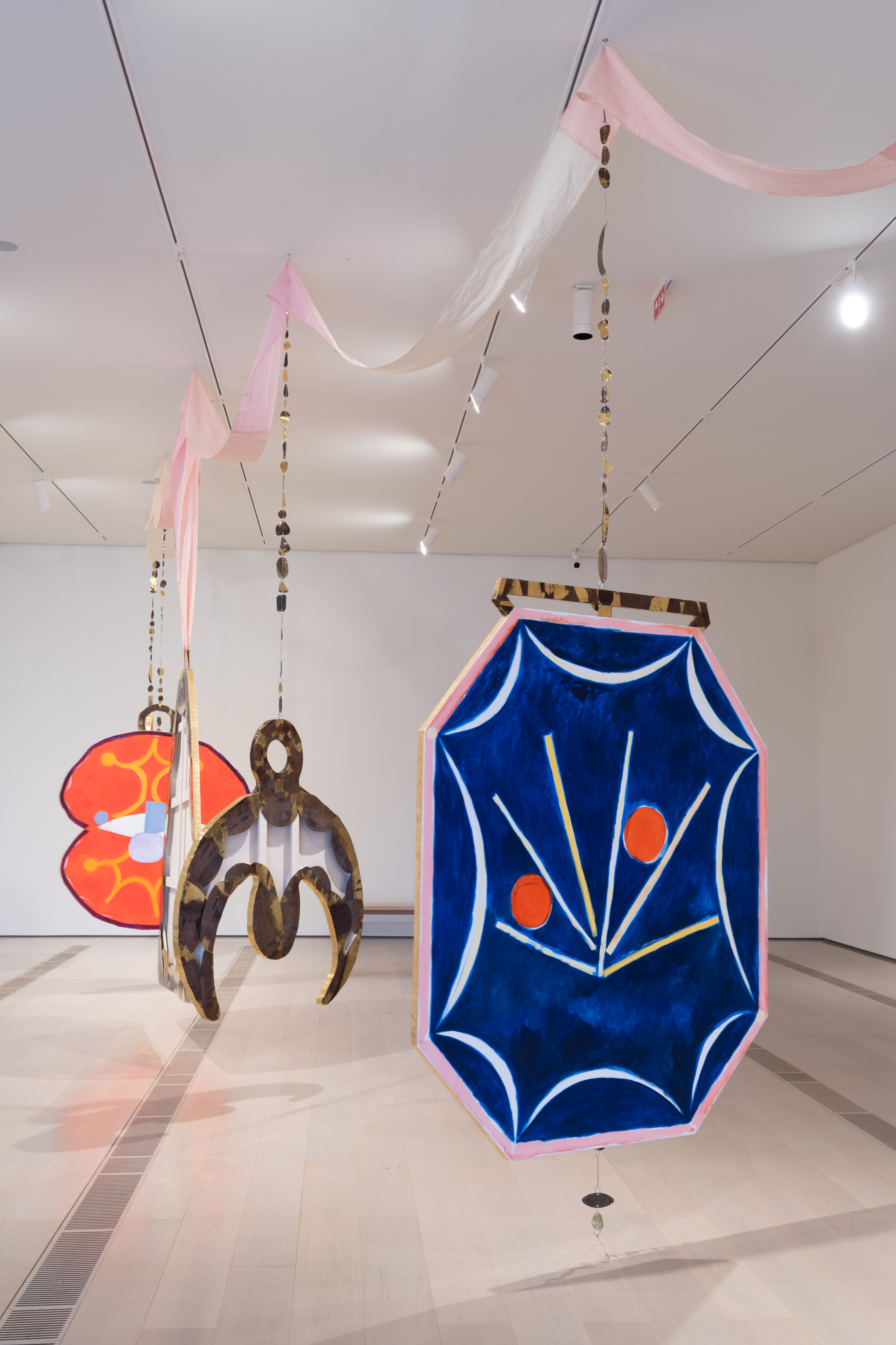 Habla, memoria, 2025, forma parte del proyecto Telesma, que investiga los vínculos entre el arte contemporáneo y las prácticas devocionales populares, como la creación de objetos votivos, talismanes y amuletos. Se presenta como una intervención espacial conformada por grandes telas suspendidas en el aire, que evocan estos amuletos de forma monumental. El espacio expositivo se transforma así en un entorno envolvente, donde los materiales y las formas sugieren un gran talismán colectivo. En las obras se mezclan dos tradiciones: la orfebrería popular, representada por láminas de latón similares a los engarces de joyas tradicionales, y la pintura gestual, con trazos inspirados en marcas y signos propios de oficios artesanales.