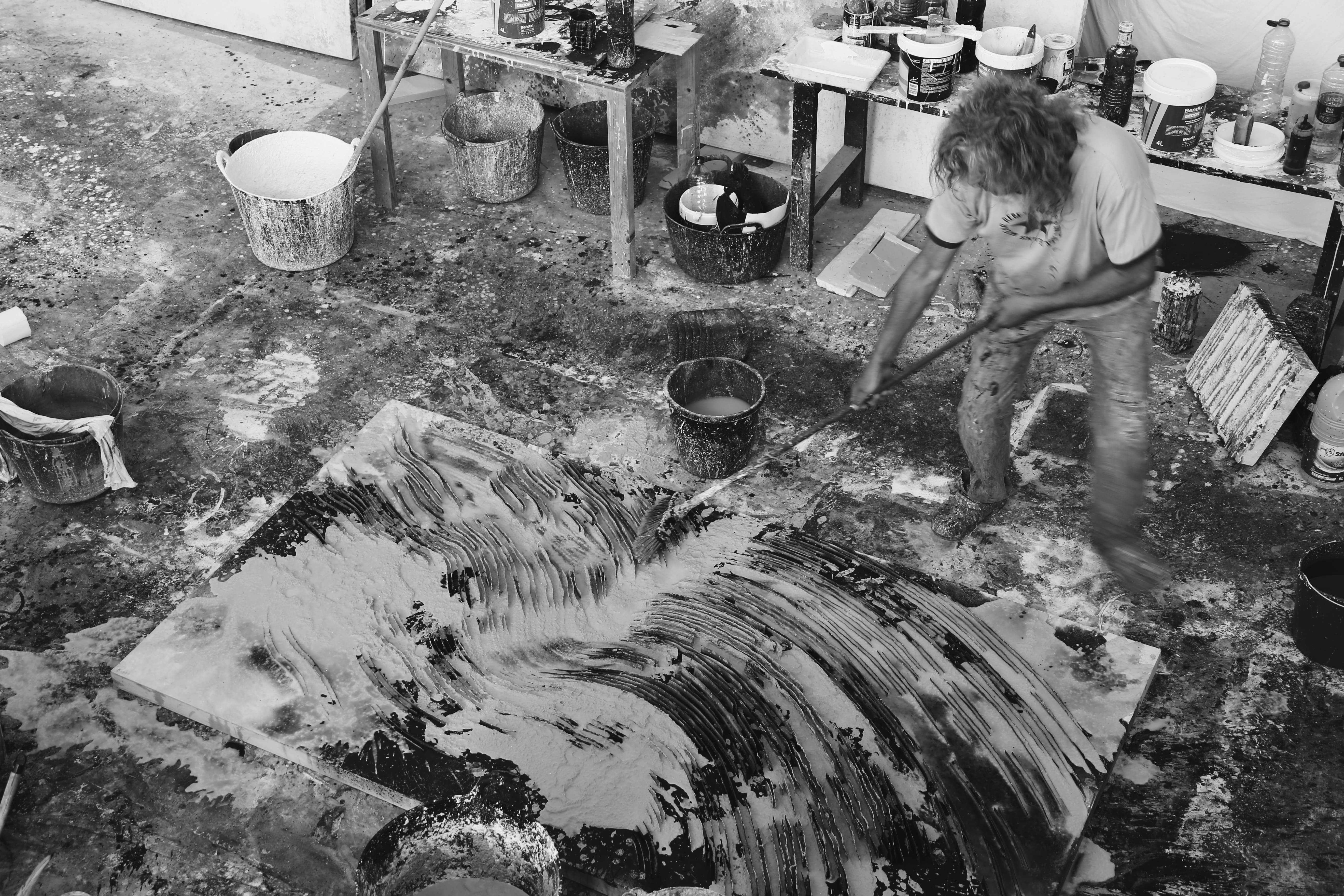 Las obras de la serie Projecte per a una illa de Guillem Nadal destacan por su gran gestualidad, conferida por el peculiar proceso creativo del artista. "Nadal trabaja con sus manos, arando el lienzo, produciendo surcos, texturas; introduciéndose literalmente en la obra", añaden los galeristas. El resultado es un juego de luces y sombras que invita no solo a ver los cuadros desde distintos puntos de vista, sino que genera en el espectador una inevitable atracción por tocar las obras.