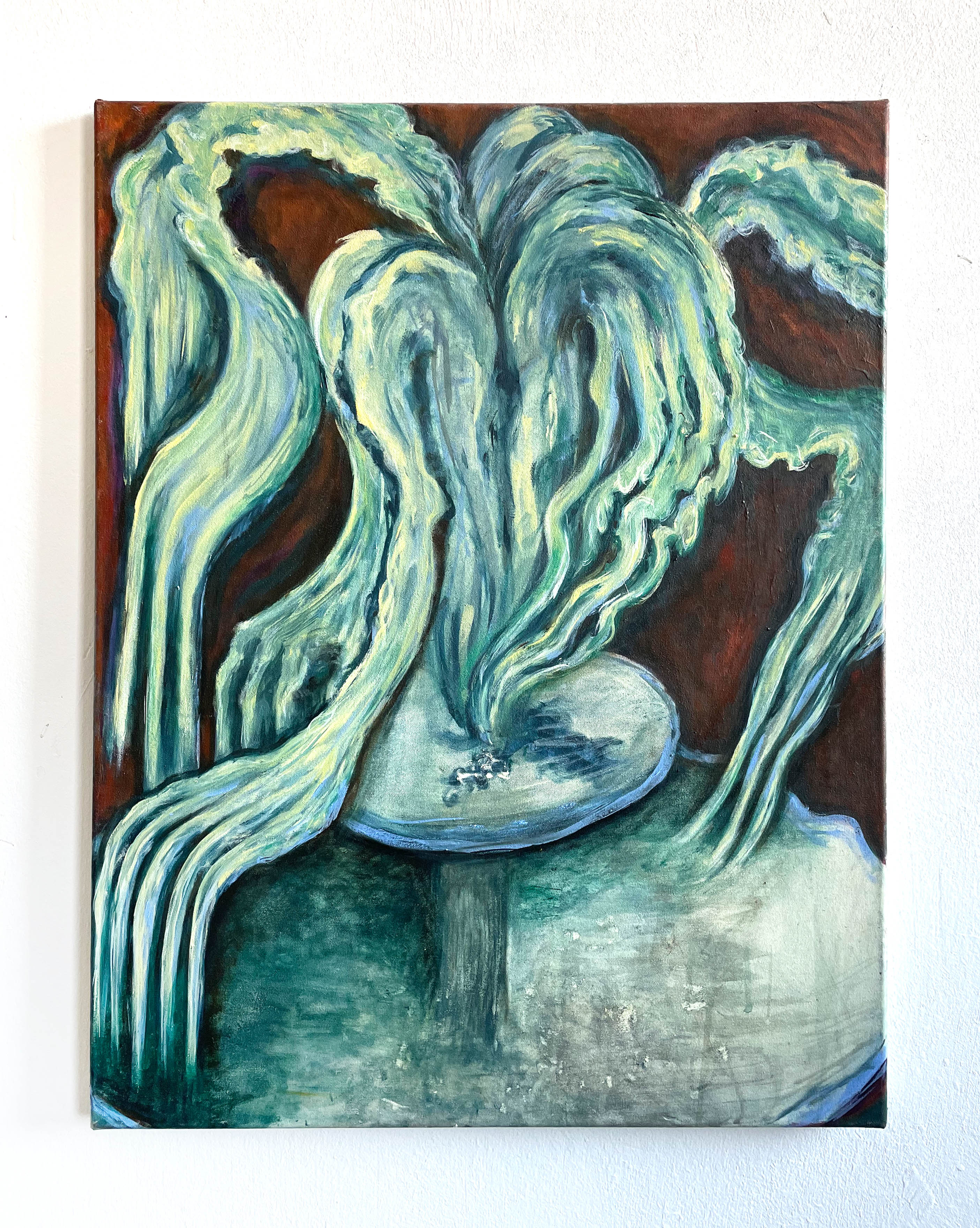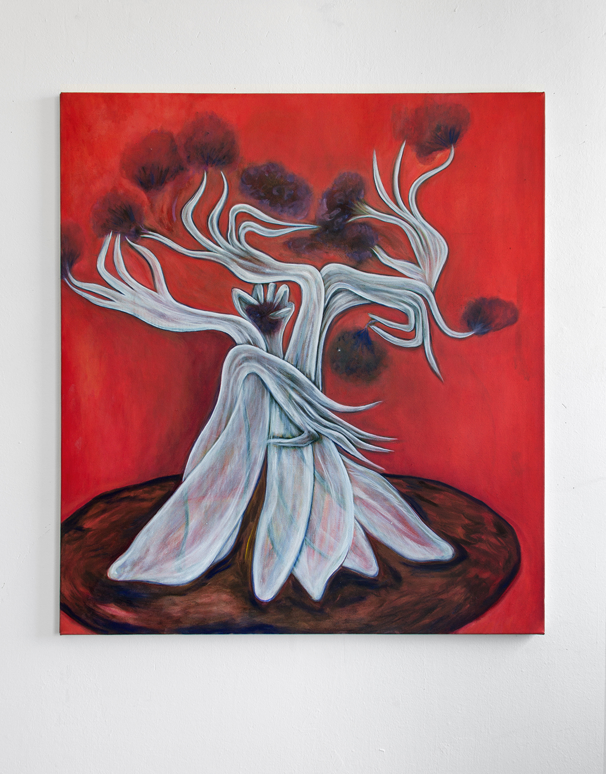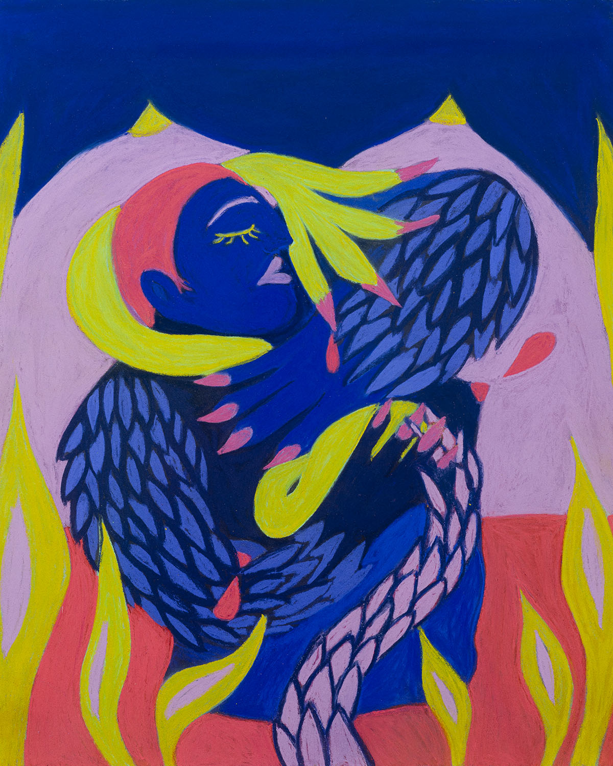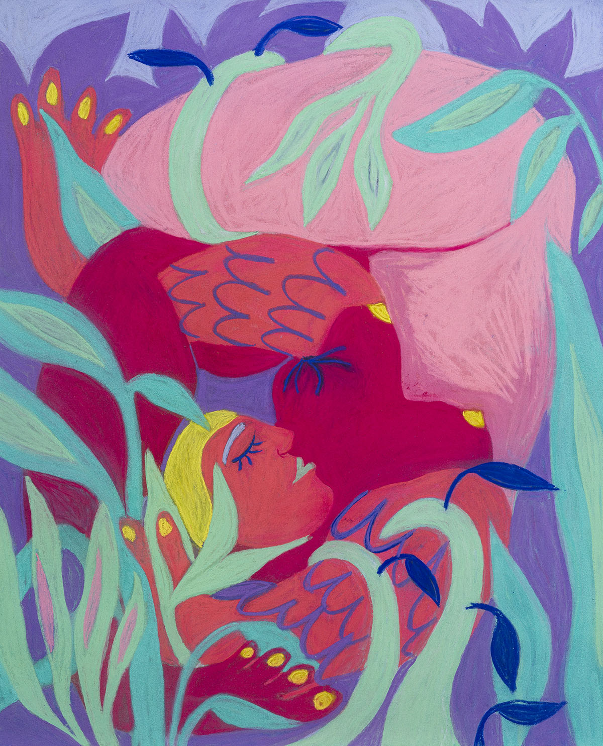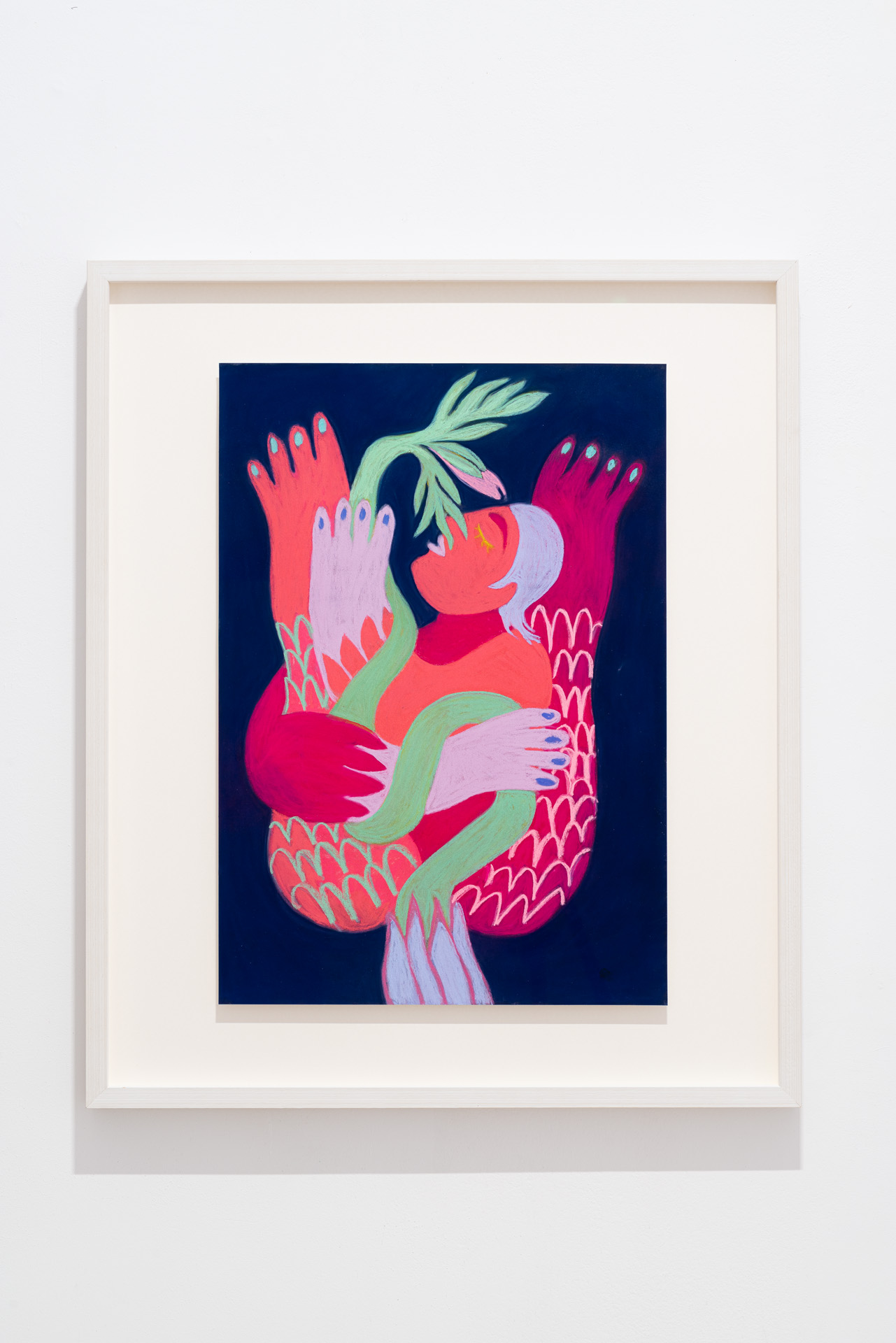 Sus pasteles de colores intensos plasman escenas íntimas protagonizadas por personajes híbridos, donde plantas y humanos sin género se enredan entre plumas, espinas y colas en un abrazo. En sus representaciones plantea una especie de utopía más allá de los géneros y de la hegemonía de lo humano sobre el resto de especies y propone una fluidez escurridiza. Acude a las plantas como compañeras pero también como modelos. Según describe Emmanuel Coccia en su libro La Vida de las Plantas, la vegetal es la forma paradigmática de estar en el mundo; un modo en el que todo se funde. Las plantas cubren la tierra pero no la dominan ni la conquistan; su modelo es resistente y flexible, basado en una arquitectura colaborativa, sin un centro de mando y profundamente adaptativa.