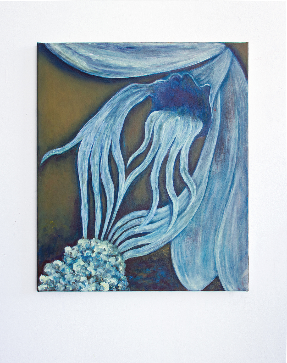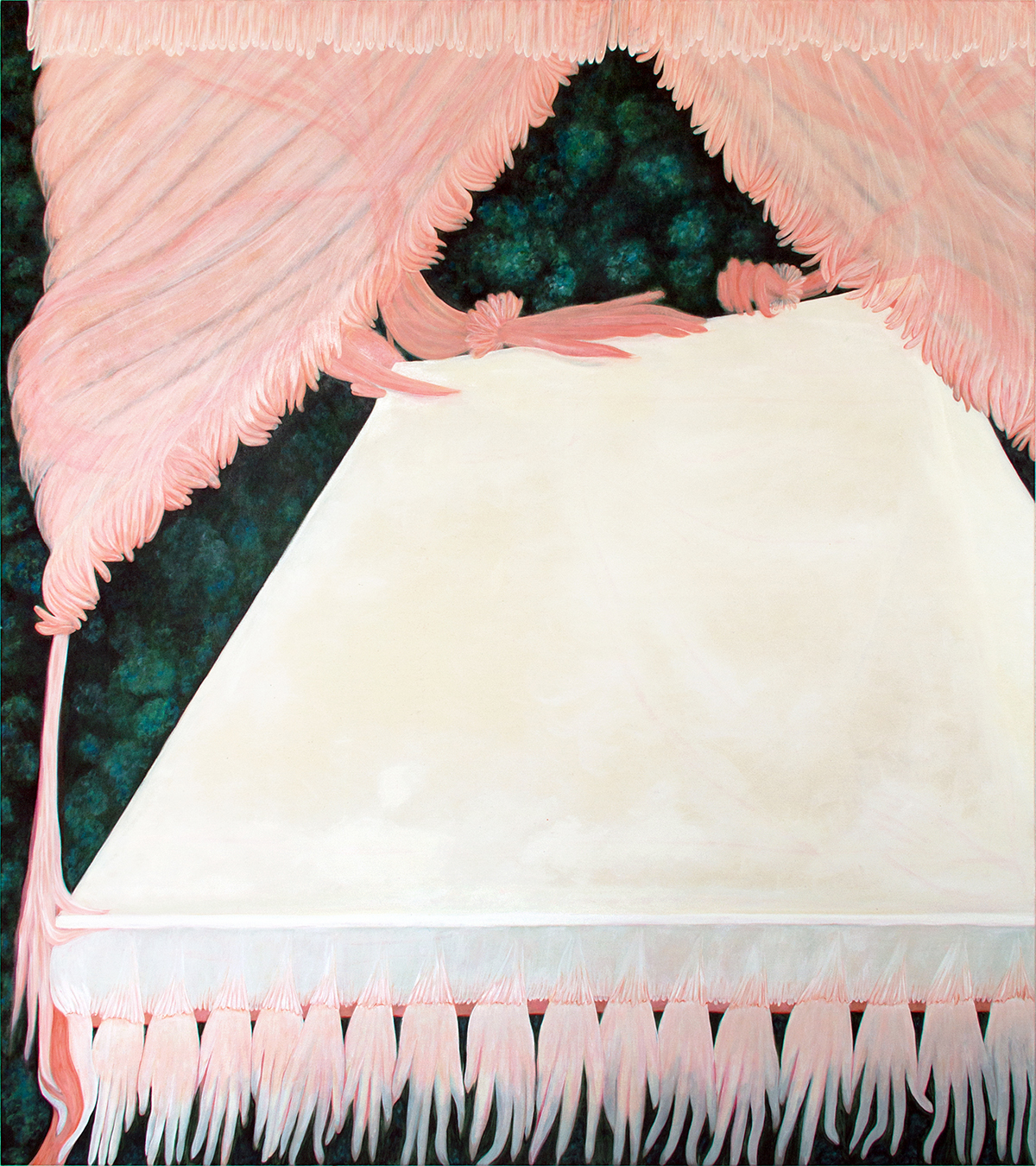 La austriaca Sarah Bechter (Viena, 1989) plantea el espacio pictórico como tablero en el que jugar al escondite a través de un proceso continuo en el que vela, borra y añade capas de pintura, construyendo escenas flotantes en las que el antagonismo tradicional entre lo que es visible y lo que no, se subvierte. Sus pinturas muestran la densidad ontológica de los mundos dúctiles, tiernos. En ellas es frecuente ser interpelado por elementos narrativos y de ficción que se nutren de cierta extrañeza, a la vez que articulan una constante ambivalencia de significado con la que hace vibrar la escena. Nos muestra espacios cotidianos en los que las formas y las figuras se entremezclan, creando un espacio representacional donde explorar cómo los afectos se generan a través del tacto en el ámbito doméstico.