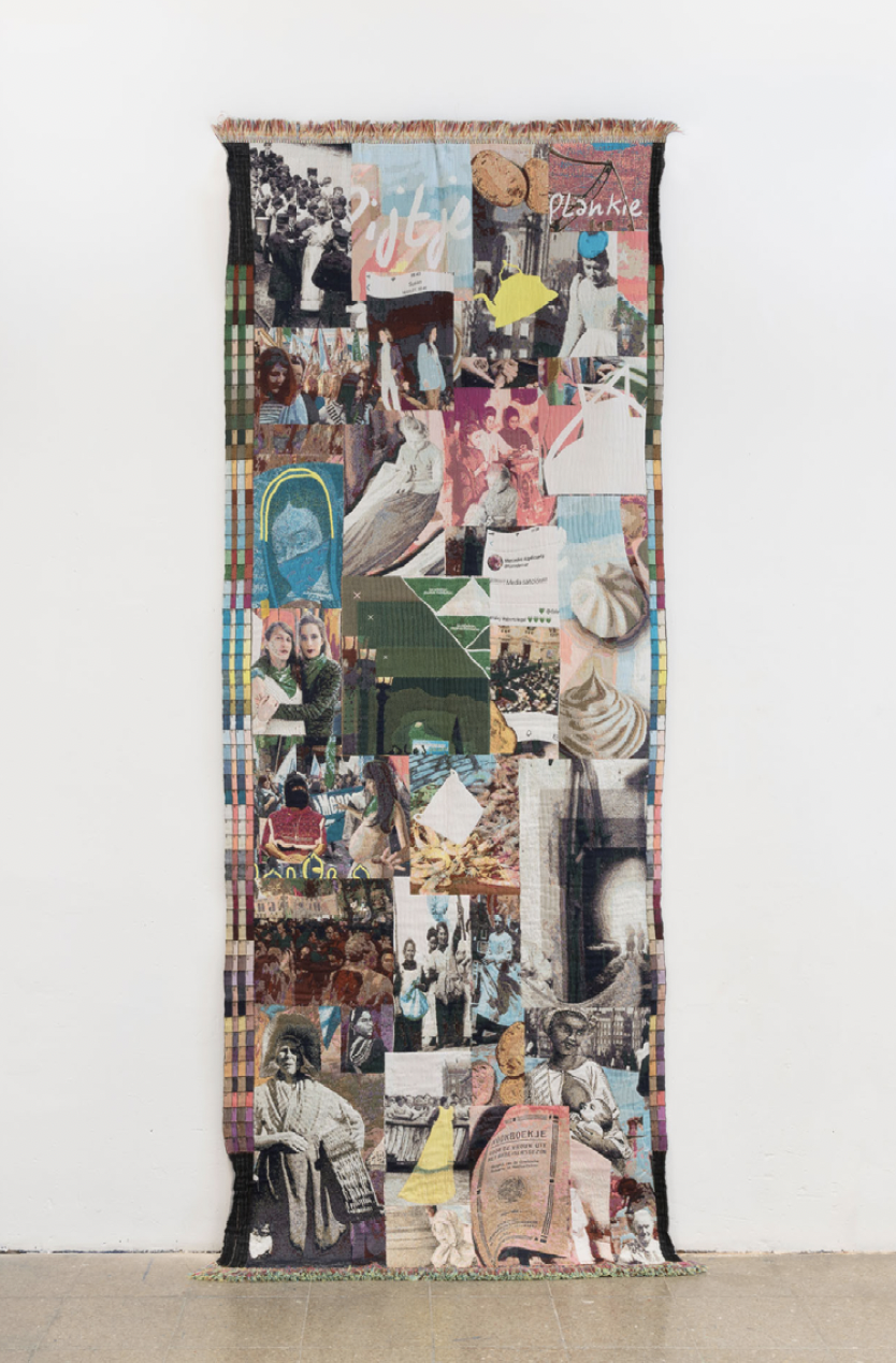 También incluimos un tapiz, visible por ambos lados, titulado Potatoes, Riots and Other Imaginaries a través del cual explora tanto los modos invisibles de organización social como la formación de la intimidad y de la solidaridad en la vida cotidiana. Retales que muestran a las mujeres que comenzaron los disturbios de la patata en Ámsterdam (1917) haciendo frente al hambre tras la guerra, junto con las luchas en contra de la violencia sistémica que sufren las mujeres de América Latina (#NiUnaMenos). El resto del téxtil queda cubierto por escenas donde diversos cuidados son llevados a cabo por enfermeras, amas de casa o empleadas domésticas. Con esta pieza la artista elabora una especie de collage en el que se plantea el valor socioeconómico del trabajo doméstico y la colectividad como una fuerza polifónica para el cambio.